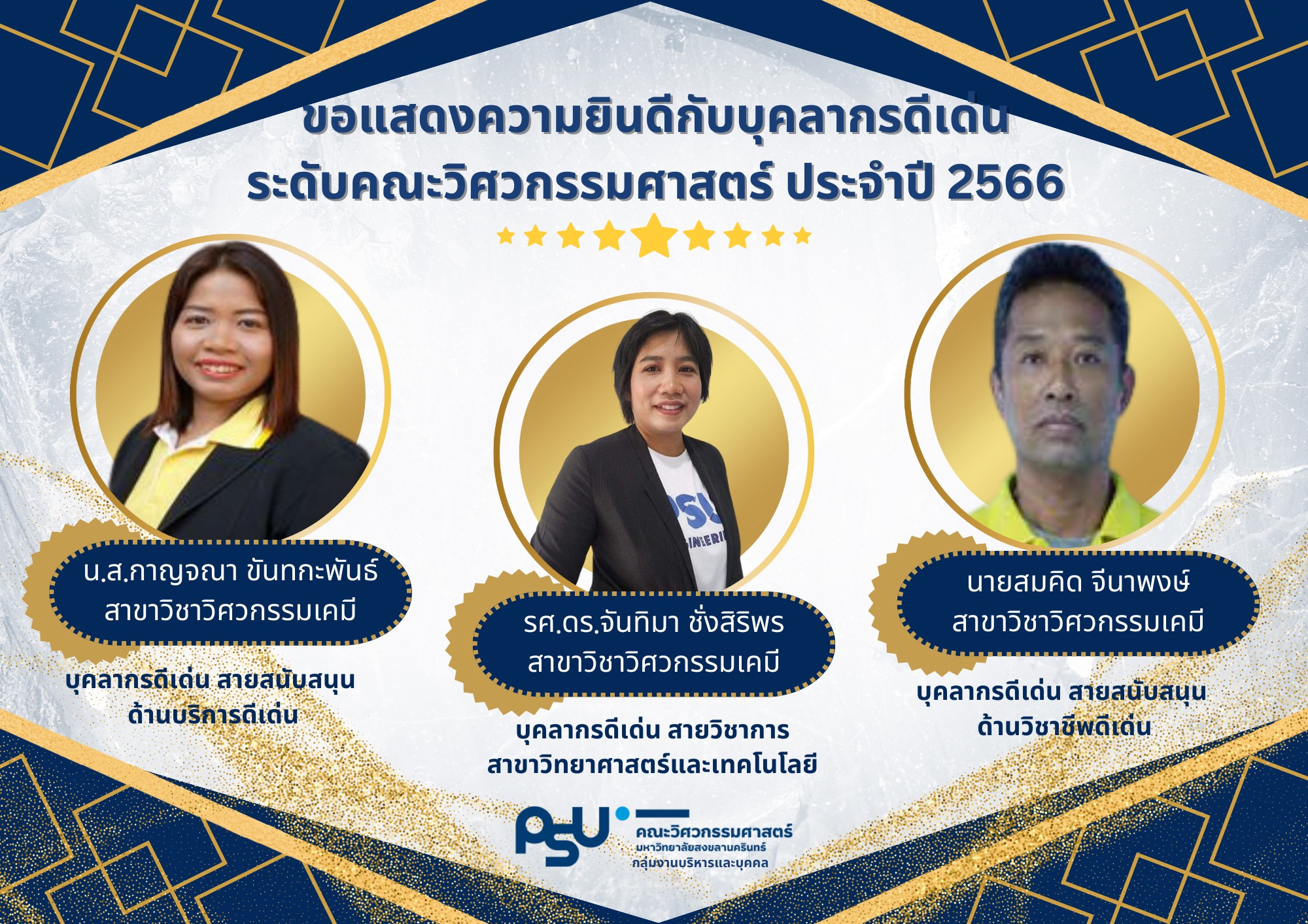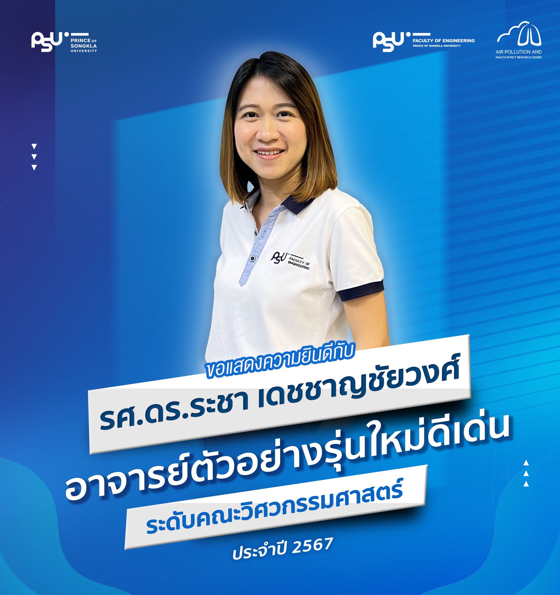 สาขาวิชาวิศวกรรมเคมี คณะวิศวกรรมศาสตร์ มหาวิทยาลัยสงขลานครินทร์ ขอแสดงความยินดีกับ “รองศาสตราจารย์ ดร. ระชา เดชชาญชัยวงศ์” เนื่องในโอกาสได้รับรางวัลอาจารย์ตัวอย่างรุ่นใหม่ดีเด่น ระดับคณะวิศวกรรมศาสตร์ ประจำปี 2567