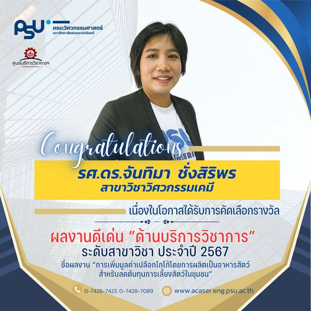 สาขาวิชาวิศวกรรมเคมี คณะวิศวกรรมศาสตร์ มหาวิทยลัยสงขลานครินทร์ ขอแสดงความยินดี กับ รองศาสตราจารย์ ดร จันทิมา ชั่งสิริพร เนื่องจากได้รับคัดเลือกรางวัล ผลงานดีเด่น “ ด้านบริการวิชาการ” ระดับสาขาวิชา ประจำปี 2567 ชื่อผลงาน “ การเพิ่มมูลค่าเปลือกโกโก้โดยการผล